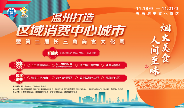 温都讯 11月18至21日,我市将举办温州打造区域消费中心城市暨第二届长三角美食文化周活动,旨在激发区域消费需求、促进共同富裕,大力培育“温州新消费”加快打造区域消费中心城市,并强化长三角区域间互动互联,助力长三角一体化发展。