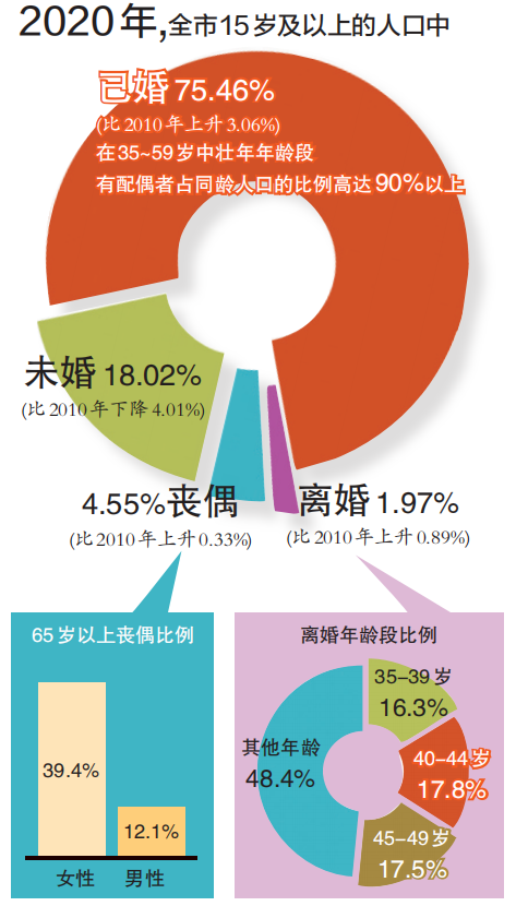 2020年,全市30~44岁常住人口未婚率16.4%,其中男性未婚率23.3%,女性未婚率8.2%。