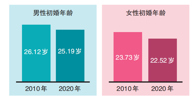 我国的法定结婚年龄为男性22岁及以上,女性20岁及以上。普查数据显示,近十年以来,全市人口的平均初婚年龄(指当年的初次结婚人口)呈提早态势。