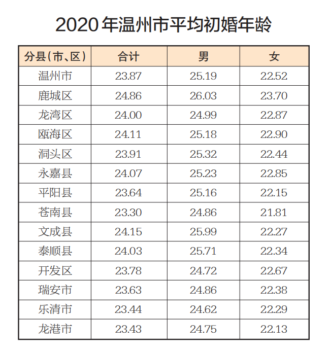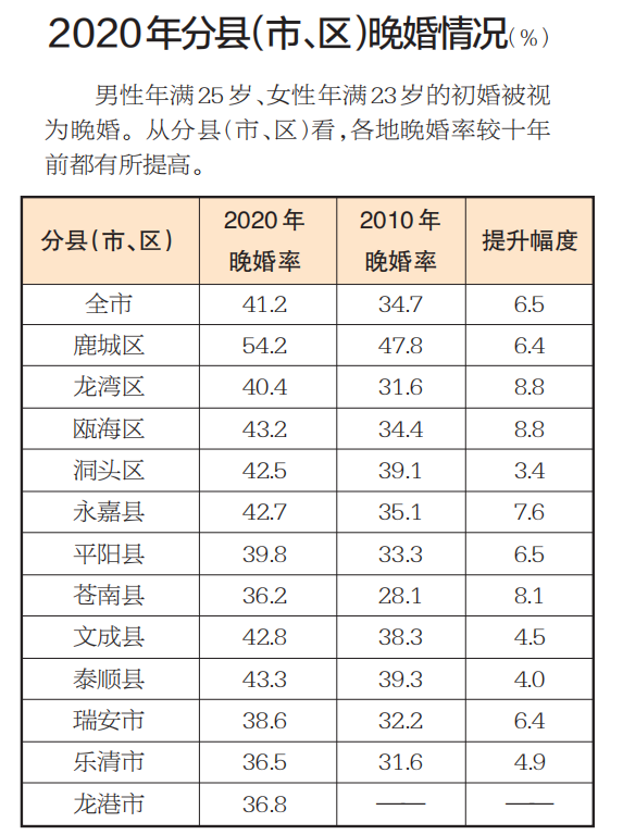 温都讯 记者昨从市统计局了解到,根据第七次人口普查数据显示,温州人婚姻家庭情况较10年前有变化,其中初婚年纪略有提早,晚婚率提高,大龄未婚率继续上升。