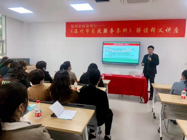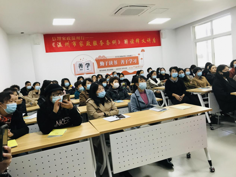 送法进市场,普法暖人心。11月23日,《信用家政温州行》在龙湾区家政服务市场开展《温州市家政服务条例》公益讲座,活动邀请了温州市人大常委会法工委规备室副主任叶英波现场解读条例。现场吸引了60多名家政服务人员参加。据悉,《温州市家政服务条例》作为全国地级市制定的首部家政服务专项地方法规,已于今年8月1日实施。