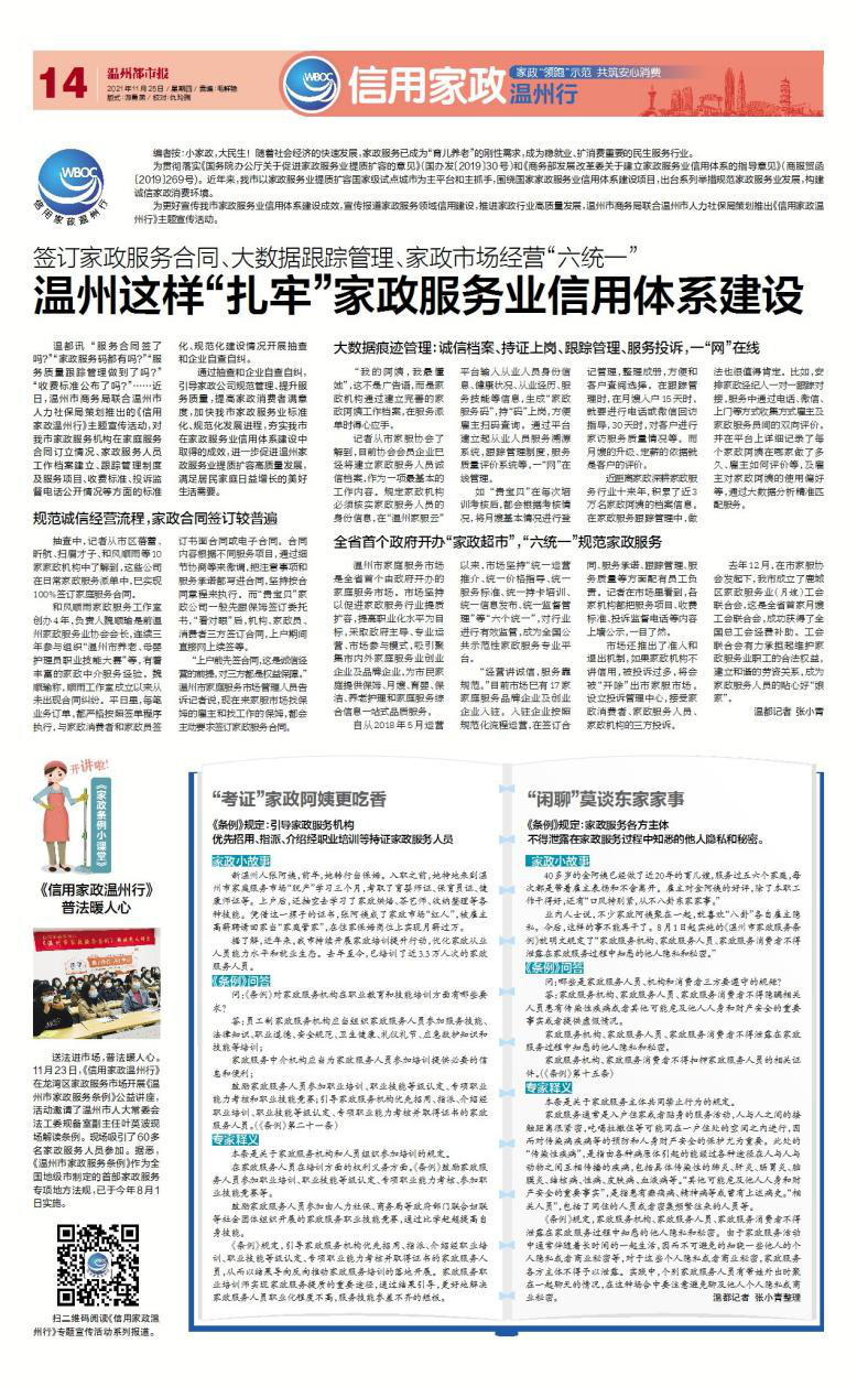 备注:今年8月1日起实施的《温州市家政服务条例》,是全国地级市制定的首部家政服务专项地方性法规,为推动我市家政服务业进一步提质扩容提供了法律保障。为让更多家政消费者和家政服务人员知法懂法用法,温州市商务局联合温州市人力社保局推出《家政条例小课堂》宣传普及条例规定。