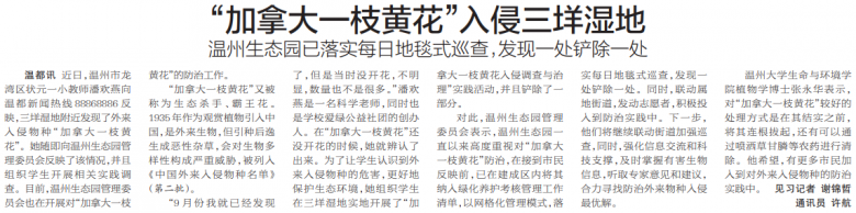 近日,温州市龙湾区状元一小教师潘欢燕向温都新闻热线88868886反映,三垟湿地附近发现了外来入侵物种“加拿大一枝黄花”。她随即向温州生态园管理委员会反映了该情况,并且组织学生开展相关实践调查。目前,温州生态园管理委员会也在开展对“加拿大一枝黄花”的防治工作。