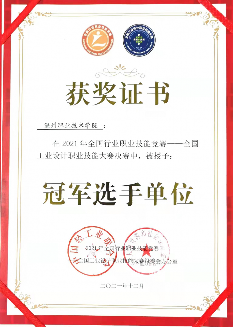 温都讯 12月19日,2021年全国工业设计职业技能大赛决赛在深圳落幕,温州职业技术学院设计创意学院鞋类设计与工艺专业参赛学生斩获鞋类设计师赛项(学生组)全国一等奖,温职院被授予“冠军选手单位”称号。这是温职院鞋类设计与工艺专业在全国赛事中取得的历史最好成绩。