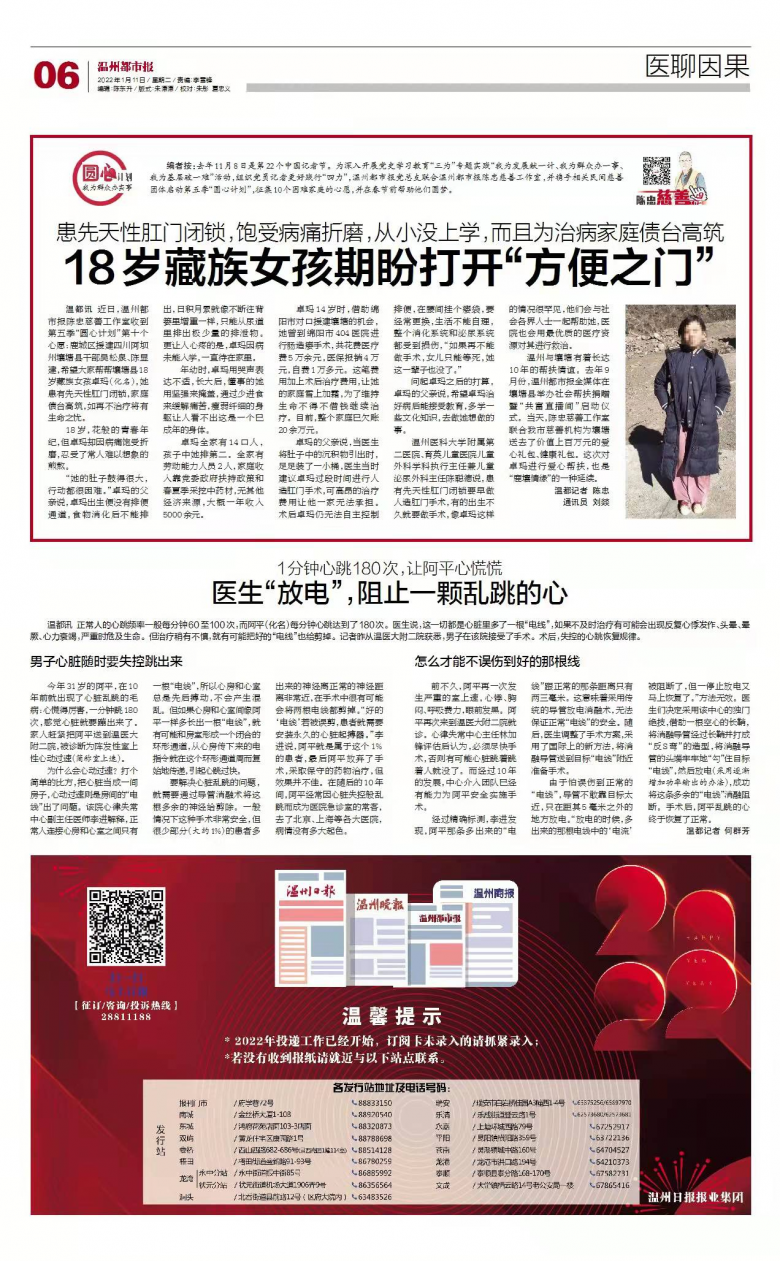 温州医科大学附属第二医院、育英儿童医院儿童外科学科执行主任兼儿童泌尿外科主任陈聪德说,患有先天性肛门闭锁要早做人造肛门手术,有的出生不久就要做手术,像卓玛这样的情况很罕见,他们会与社会各界人士一起帮助她,医院也会用最优质的医疗资源对其进行救治。