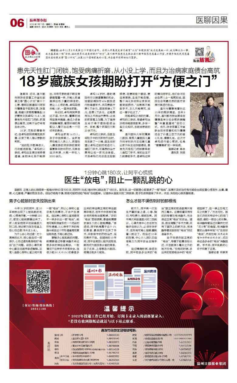 温都讯 四川壤塘县18岁的藏族女孩卓玛(化名)患有先天性肛门闭锁,无法正常方便,面临生命之忧,今天本报以《18岁藏族女孩期盼打开“方便之门”》为题对此进行报道后,市民纷纷来电称“我们一起帮帮她,接亲人来温州治病”,并踊跃捐款。截至当天下午5时,已有90多名爱心人士为卓玛捐赠了30606元。