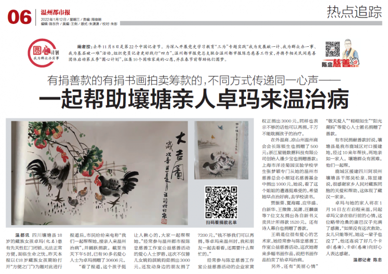 “看了报道,这个孩子挺让人揪心的,大家一起帮帮她。”经常参与温州都市报陈忠慈善工作室公益慈善活动的爱心人士罗碧,这次不仅替儿女姚钧淇姚钧茹捐出3000元,还发动身边的朋友捐了7200元,“钱不够我们可以再捐,等卓玛来温州时,我和朋友一起去看看,还需要什么帮忙的。”