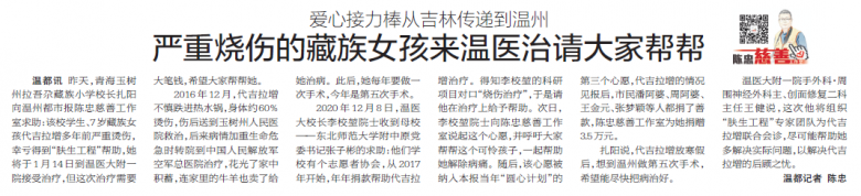 2020年12月8日,温医大校长李校堃院士收到母校——东北师范大学附中原党委书记张子彬的求助:他们学校有个志愿者协会,从2017年开始,年年捐款帮助代吉拉增治疗。得知李校堃的科研项目对口“烧伤治疗”,于是请他在治疗上给予帮助。次日,李校堃院士向陈忠慈善工作室说起这个心愿,并呼吁大家帮帮这个可怜孩子,一起帮助她解除病痛。随后,该心愿被纳入本报当年“圆心计划”的第三个心愿,代吉拉增的情况见报后,市民潘阿婆、周阿婆、王金元、张梦颖等人都捐了善款,陈忠慈善工作室为她捐赠3.5万元。