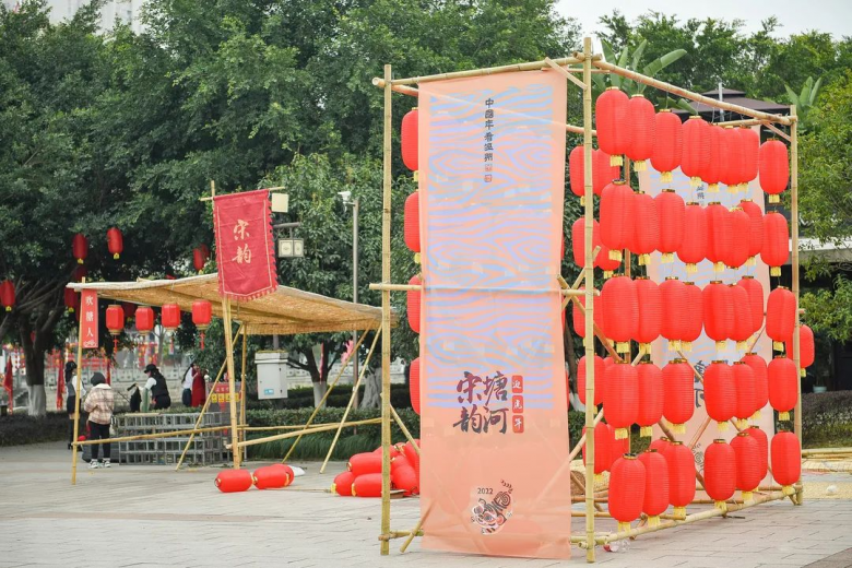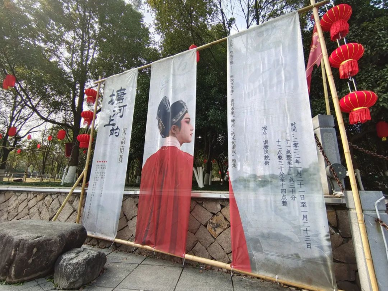今天上午,记者“探营”位于市区印象南塘活动地点,记者看到,该活动区域内的河边和桥边都插上了印有“宋”字的旗幡,颇有影视剧中“梦回宋朝”的感觉。西侧桥头的大型牌坊,挂满了红灯笼,河畔的大树上也都挂上了喜庆的灯笼。光影与树影下,灯笼点缀渲染了节日气氛,不少市民昨天已“打卡”拍照。据主办方介绍,为了体现宋韵主题和节日气氛,此次活动在南塘河畔布置了近千只灯笼、近200面仿古旗幡。