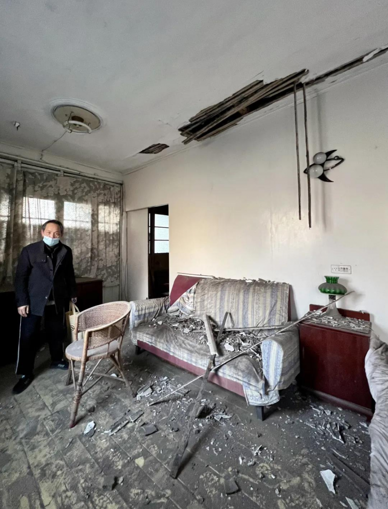 岳宅二楼一房间内一片狼藉,天花板多处掉落