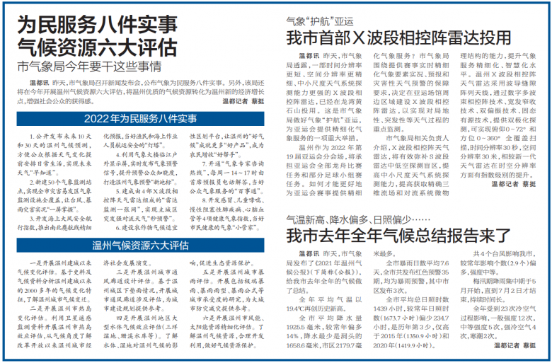 温州作为2022年第19届亚运会分会场,将承担亚运会全部龙舟比赛任务和部分足球小组赛任务。如何才能更好地为亚运会赛事提供精细化气象服务?市气象局围绕提供赛事实时精细化气象要素实况、预报和灾害性天气预警的保障要求,决定在亚运场馆周边区域建设X波段相控阵雷达,以实现对局地性、突发性等天气过程的重点监测。