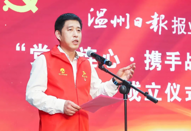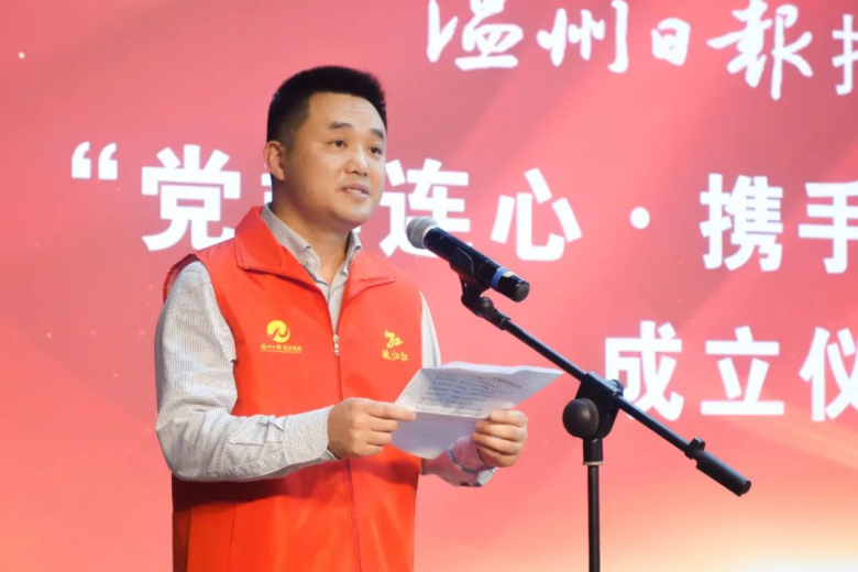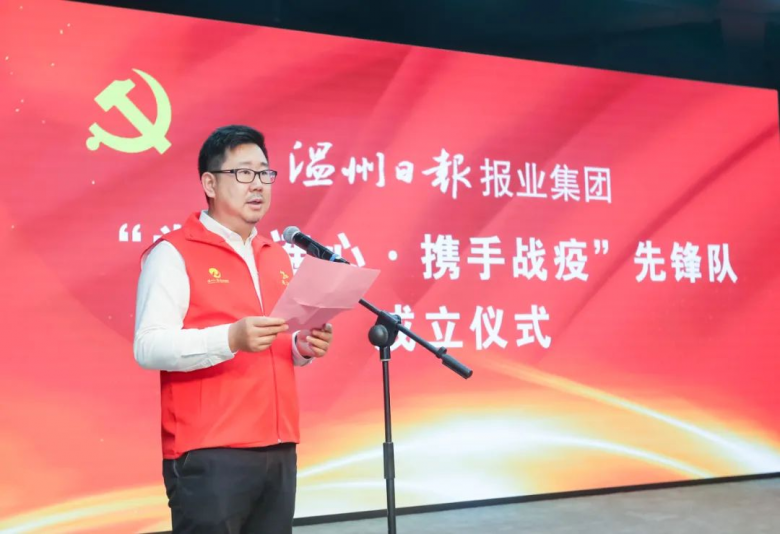成立仪式上,王启龙宣读《关于成立温报集团“党群连心•携手战疫”临时党委(战疫先锋队)的通知》。