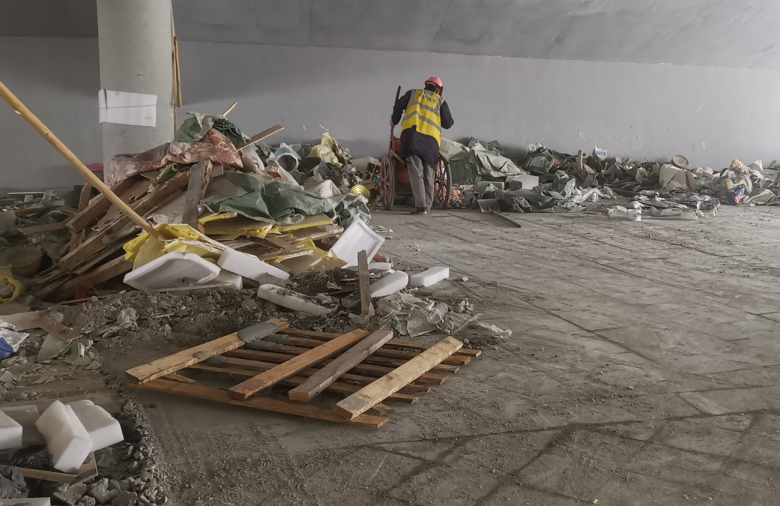 温州奥体中心主体育场一楼一阶梯下方,垃圾随意堆放