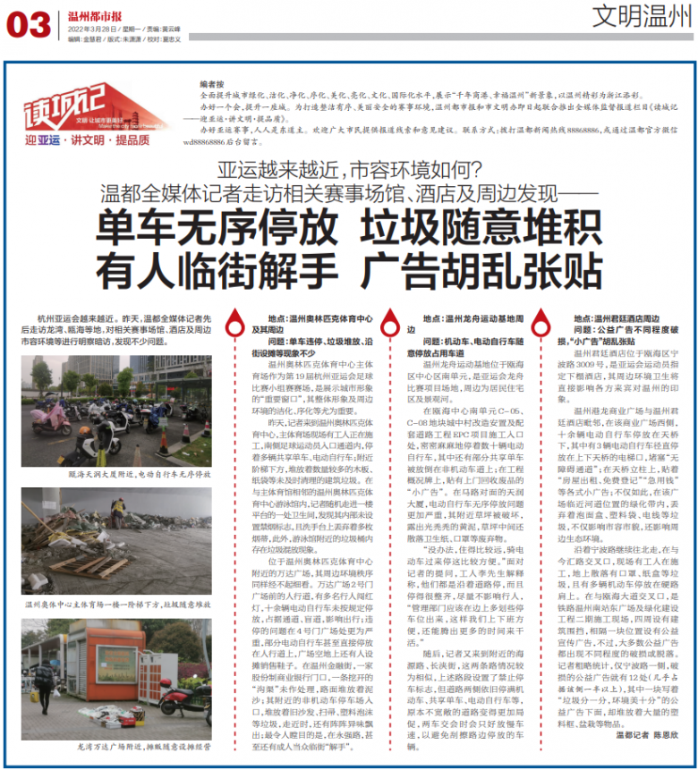 办好一个会,提升一座城。为打造整洁有序、美丽安全的赛事环境,温州都市报和市文明办即日起联合推出全媒体监督报道栏目《读城记——迎亚运·讲文明·提品质》。