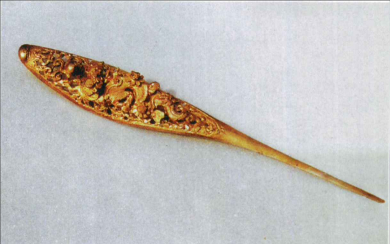 其中一支南宋鎏金叶形龙纹簪,长19.5厘米,重11克。簪面以镂空缠枝细花纹衬地,边沿浅刻细珠纹,錾刻一戏珠蛟龙,腾空而起,直逼火珠。造型玲珑剔透,精美绝伦。