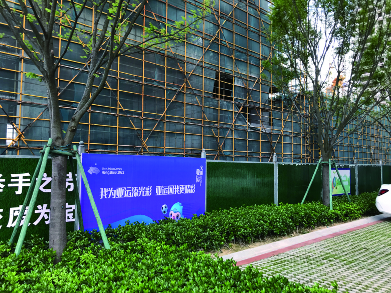 此外,《方案》还要求“做好亚运主体公益广告宣传围挡”,记者在酒店东面的临时围挡上发现了“我为亚运添光彩 亚运因我更精彩”的宣传牌,此处也是当天走访发现仅有的一处有亚运元素的建筑工地。但记者也发现,在该围挡的上方能看见外脚架安全网存在破损。酒店南面、西面的建筑工地围挡均未看到亚运宣传元素。此外,围挡外侧的仿真绿草皮也没有完全铺满,一些地方仅铺了一半。