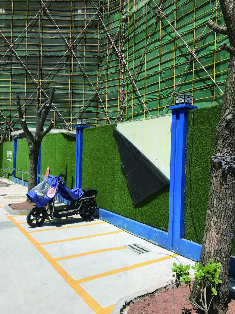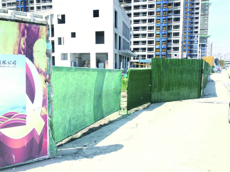 进入项目场地后可以看到,施工围挡制式并不统一,同一侧的围挡竟然由砖石、布料、仿真草皮、金属等四种材质构成。另外,围挡的仿真绿草皮铺盖也不完整。