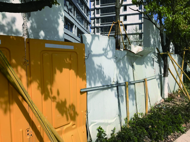 该项目沿商汇路一侧采用的是固定围挡,而沿龙舟基地一侧采用的是临时围挡,宋力向记者解释,由于龙舟基地施工完成后,地面高度有所提升,原本的围挡高度不足,因此在外围加了一层临时围挡。