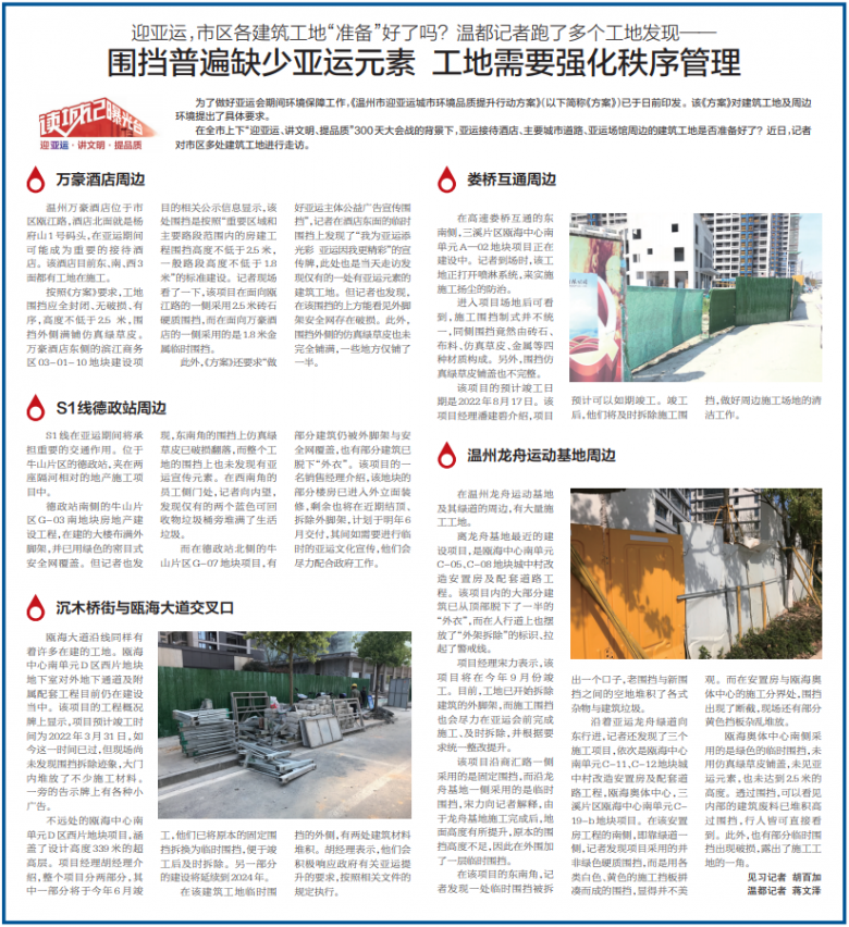 建筑工地及周边环境的秩序、整洁、美观,关系亚运期间贵客们对温州城市的印象。为了做好亚运会期间环境保障工作,《温州市迎亚运城市环境品质提升行动方案》(以下简称《方案》)已于日前印发。该《方案》对建筑工地及周边环境提出了具体的要求,其中主要包括工地围挡、大门出入口、施工扬尘、生活区环境卫生、临时工棚等5大方面。