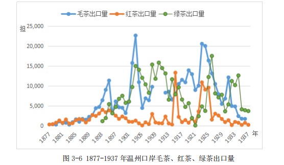 当时的毛茶除小部分篓装茶用于内销苏州、杭州、上海等处外,绝大多数箱茶均转运外洋,远销欧美各国,每年约值银元20余万,这进一步提高了温州口岸在对外贸易中的地位。