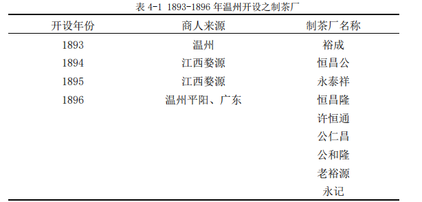 1893年,本地“裕大”南北货行在温州南门外创设了“裕成”茶栈,聘请安徽徽州茶叶技师前来指导,并且雇佣300名女工,专制外销茶,裕成茶栈所制箱茶运至上海转销国外。