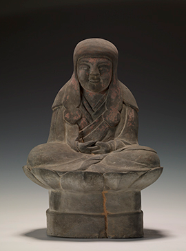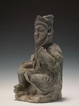 另有一尊砖雕泗州大圣坐像,通高46厘米,头戴风兜,两边宝缯下垂至胸。面容圆润丰满,弯眉长目,眼眶微凹,嘴角含笑。内着三层交领襦衣,外罩通肩袈裟,右裾缠绕在左肩上。双手掌心向上仰置于腹前结印,结跏趺坐仰莲台座上。通身施朱红色彩,出土时表面色彩保存最为完好。