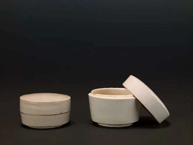 一件通高4.4厘米,口径4.4厘米,足径3.2厘米。另一件通高2.9厘米,口径4.1厘米,足径3.3厘米。圆形,带盖,字母口,盖面弧平,直壁,矮圈足,平底。白胎,胎质细腻。通体施白釉,釉质细腻。釉色略有区别,一件较白,另一件呈象牙白,略泛黄色。盒盖、盒身卯合处均无釉,呈“芒口”特征。