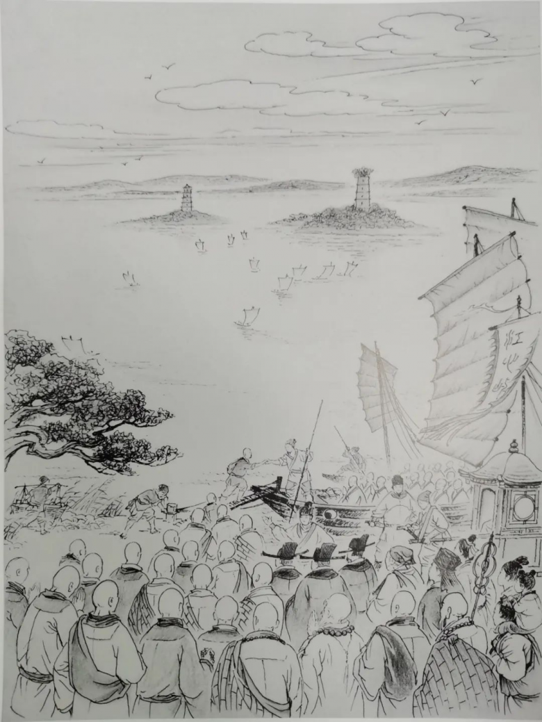 清了禅师亲率僧众运石块填塞两屿间的湍急川流,使之连成整体。张亮绘