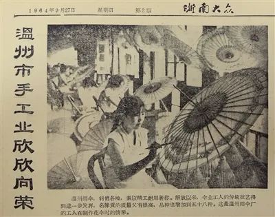 上世纪六十年代温州雨伞厂画师正在花伞上绘画,刊登于1964年《浙南大众》(今温州日报)。