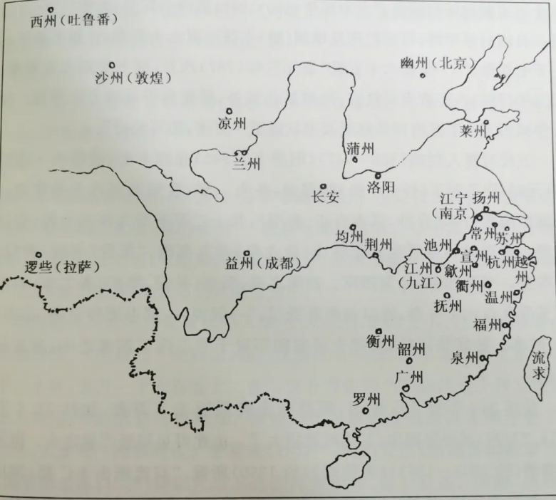 隋唐五代时造纸中心分布图,潘吉星绘(1998)