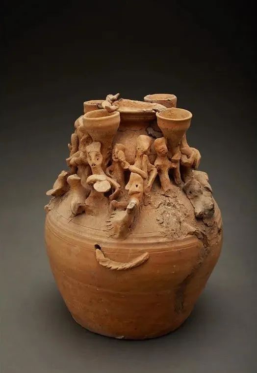 这件三国瓯窑青瓷堆塑谷仓罐明显受到了西域文化的影响。罐高28厘米,腹径23.6厘米,底径16厘米,上部堆塑5个小罐,中间的1个小罐较大,盘形口,下与罐腹相通,四周的4个小罐呈漏斗形,下端与罐腹不能相通。罐身上堆塑有14个人物,以及狗、乌龟、小鸟等飞禽走兽。这14个人物均头戴高帽,高鼻深目,且姿态各异,有的呈站姿,有的呈坐姿,有的在吹笙,有的在击鼓……貌似胡人。