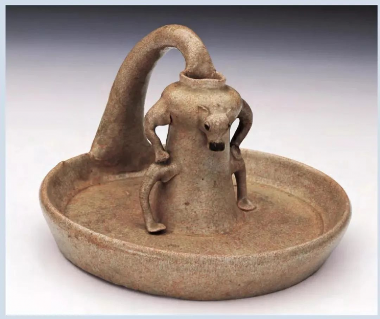 1956年出土于瑞安丽岙白门乡。高13.4、口径18.9、底径17.8厘米。灯柱为一牛犊,作拟人状直立,前肢似插腰,后腿作骑马蹲裆式;牛身为中空圆柱,顶端和末端后壁开方孔,用以插入灯芯。牛尾为圆曲柄,连接灯柱口和灯盏盘口。牛眼、嘴绘饰褐彩。