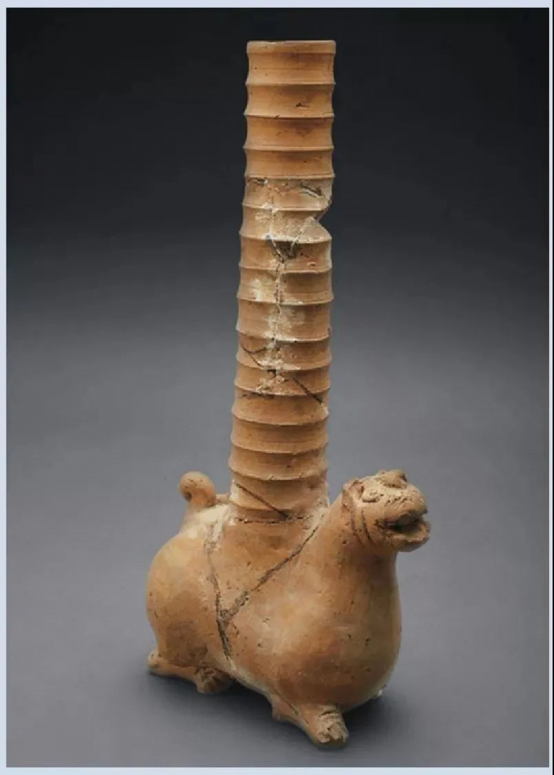 1958年出土于永嘉瓯北镇礁下山东晋墓。通高30.1厘米,造型独特,主体是身躯肥胖的跪卧虎,虎首高昂,怒目裂齿,表情憨厚;背负一竹节状长筒形灯柱。