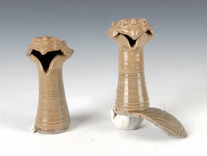 出土于温州市区东门河床。残高约15厘米,凤首、长颈、圆肩。凤头尖喙,圆凸眼,后脑羽毛纤细逼真。颈部饰弦纹,肩部刻花卉图案。内外施青黄色釉,匀净细腻,滋润透亮。