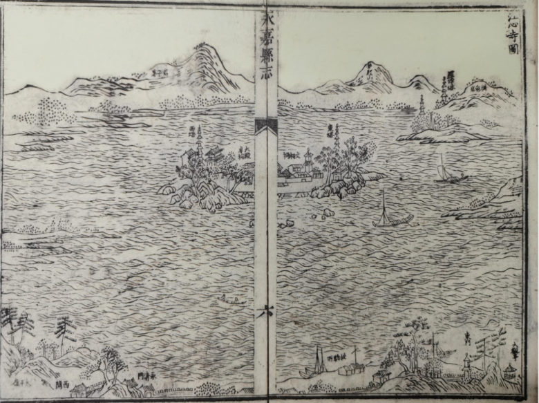 江心寺图,清乾隆《永嘉县志》卷首所载,描绘乾隆年间江心屿上的祠宇与东、西双塔