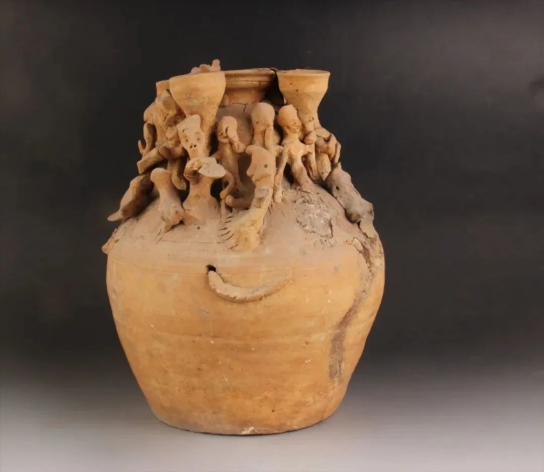△瓯海出土的三国瓯窑堆塑谷仓罐,上面的人物高鼻深目,貌似胡人