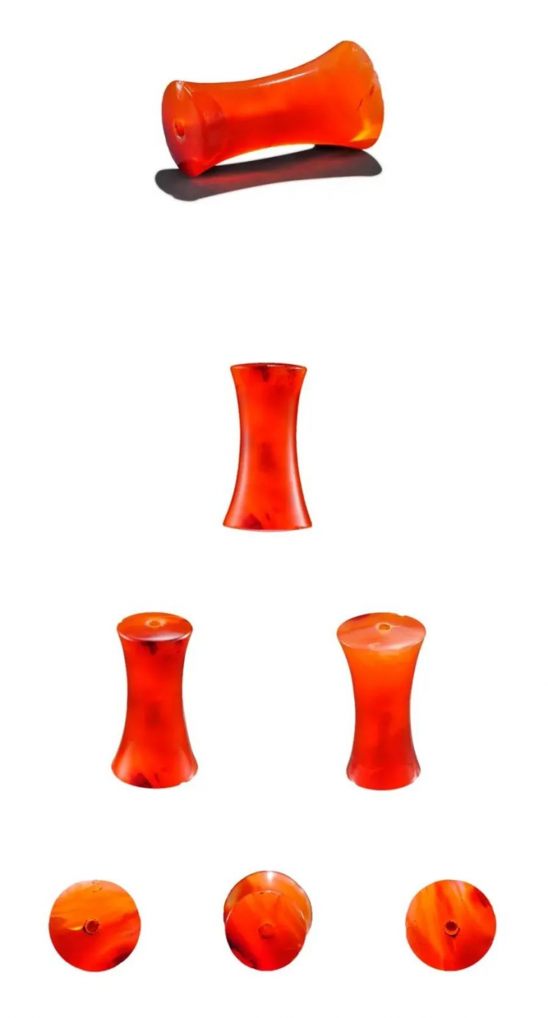 2007年,永嘉瓯北的六朝土坑墓出土了一件十分漂亮的红色宝贝——玛瑙束腰柱形小饰件。其色泽透亮,中有穿孔,曲线流畅,装饰性很强。这块1000多年前的红玛瑙应该是来自中亚或西亚。