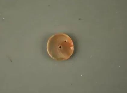 △该玛瑙扣有小孔,色泽透明有沁色,径约2.5厘米(图片由温博提供)