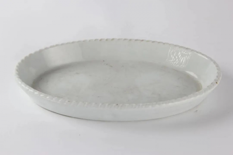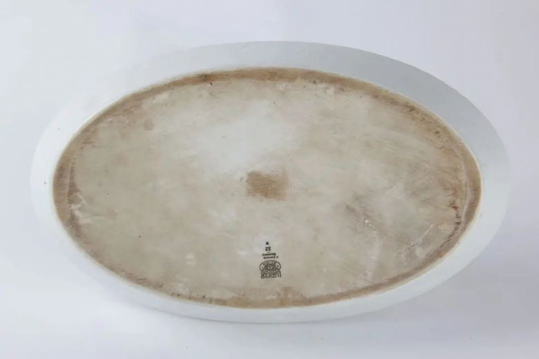 盘高4.2厘米,长口径31.9厘米,短口径18.8厘米,长底径27.4厘米,短底径15.8厘米;胎质细腻,除底部外通体施白釉,釉面细腻莹润,外底露胎呈米汤色。此外,底部印有黑色商标和地名,该盘为德国巴伐利亚州的Bauscher Weiden公司生产的白瓷盘。此公司为欧洲著名的陶瓷生产商。