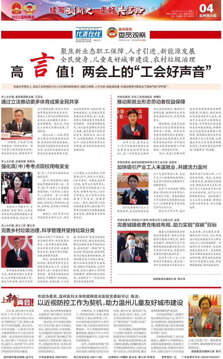 在温州市两会上,来自工会系统的6位人大代表和政协委员,就职工保障、人才引进、新能源发展、环境治理等方面发出了接地气的“好声音”。