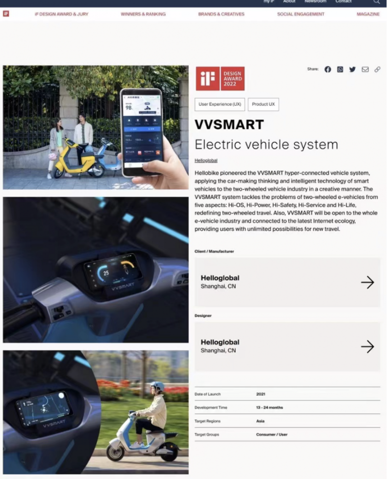 VVSMART超连网车机系统斩获iF奖,也意味着哈啰将两轮电动车行业的竞争,从过去的硬件比拼,提升到一个全新的维度。