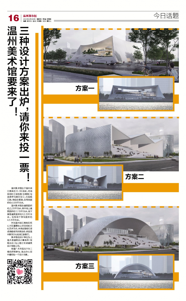 希望广大市民一同参与到温州美术馆建筑造型的评选中,选出自己心目中最好的一个设计方案。