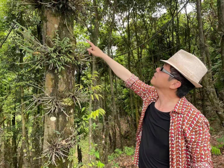 该基地位于泰顺县龟湖镇龟湖村南山,只见一批铁皮石斛生长于一个个大棚之内,还有一丛丛铁皮石斛寄附一株株树身而生,其茎条饱满粗壮,长势良好。野生的铁皮石斛常附生于高海拔悬崖峭壁或林内树干,因此该基地铁皮石斛采用活树附生栽培,山泉雾化浇灌,不施肥不用药,最大限度地还原了野生铁皮石斛的生长环境,有利于其品质的提升。