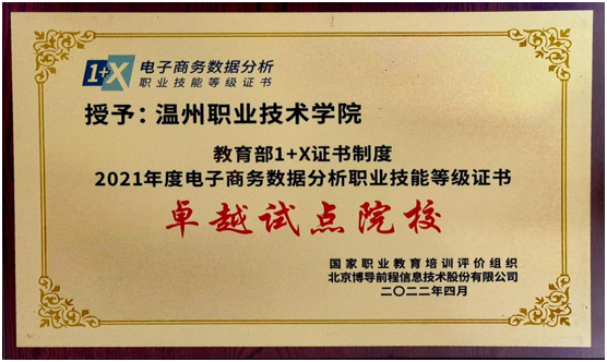 上月,2021年度教育部1+X电子商务数据分析职业技能等级证书的试点工作表彰会暨2022年岗课赛证融通育人模式研讨会在线上举行,会议对239个先进单位、493名先进个人和62个优秀案例进行公示表彰。温职院获得“卓越试点院校”“优秀考核站点”称号,案例《电子商务数据分析“书证融通”人才培养模式》被评为“全国优秀案例”,多名教师被评为“优秀指导老师”“优秀考务管理员”,并获得“突出贡献者”奖项,该奖项全国仅2人。