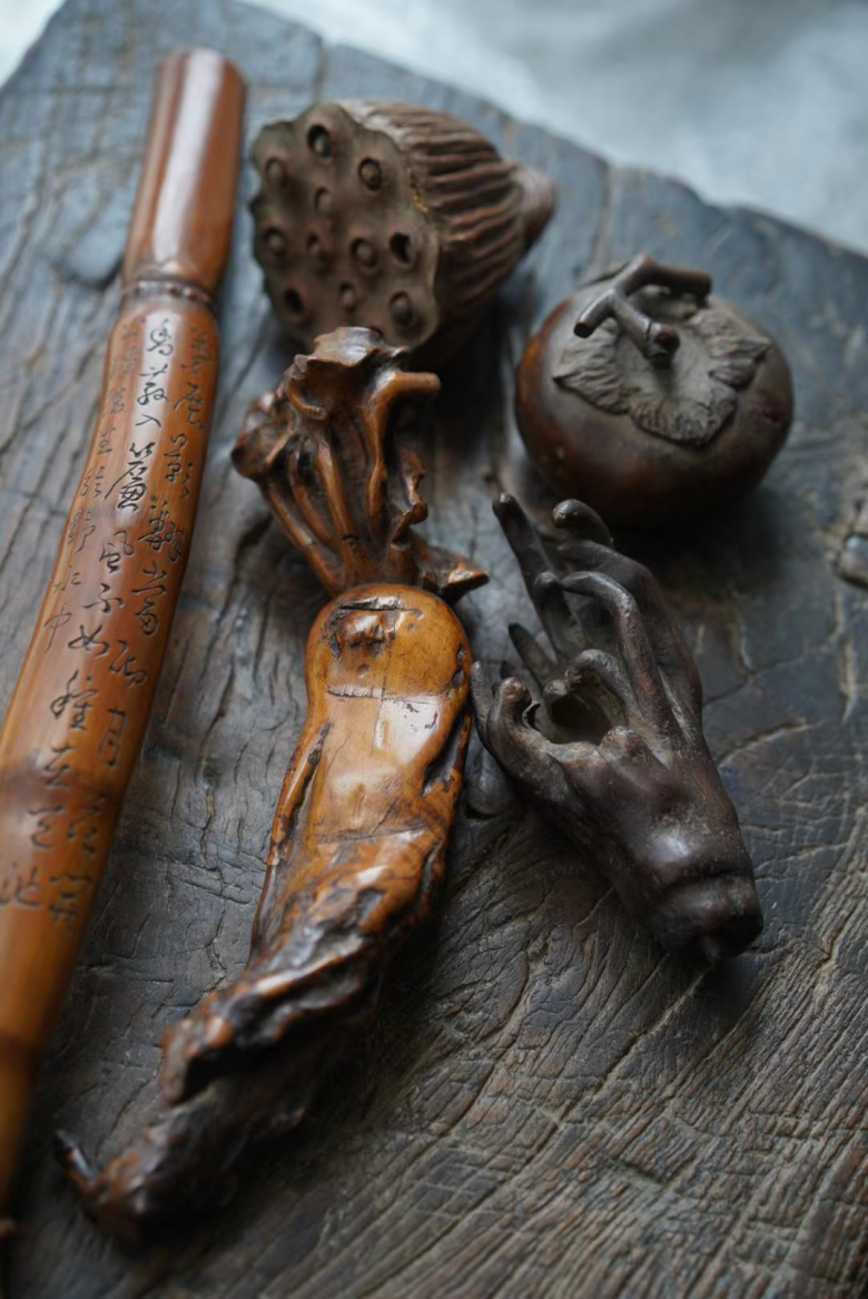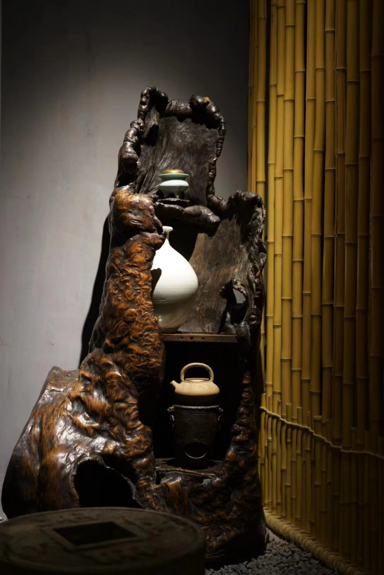 在这次参加青灯市集的古器物中,有两件珍藏值得一说。一件是奇木柜子,属于瘿木类,就是树根长瘤的位置。清朝中期,日本人对这类天然的东西很喜欢,会特意取材加工成器物。这件奇木柜子花了他5年时间才到手,最早是在日本市场上看到,因价格和运输等问题没有买下来。2020年,他竟然在山东再次遇到它,当时他就觉得这种缘分太奇妙了,无论如何都要把握住这次机会。尽管对方开价很高,但他始终不放弃,最后以诚意打动了对方。为了不损坏柜子,他特意租了车子运回来。