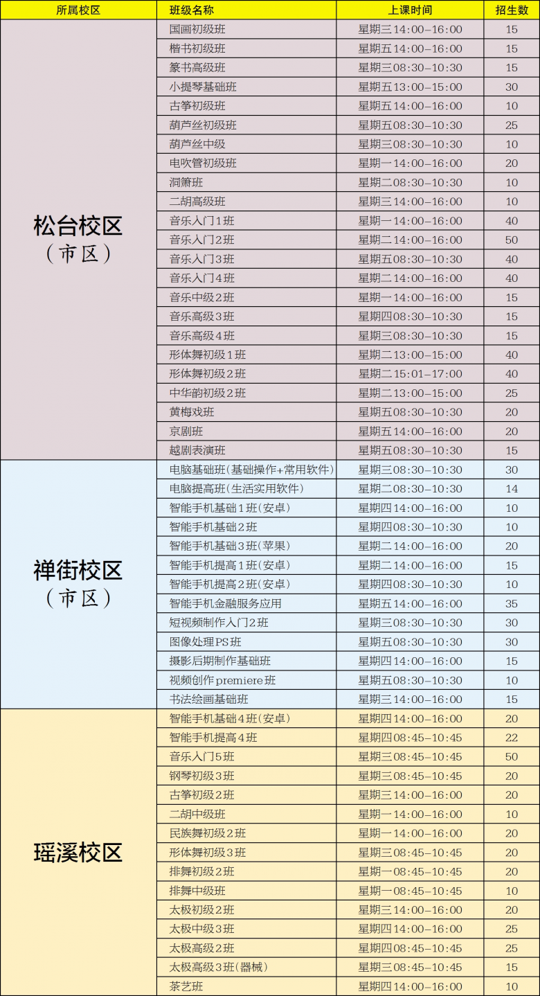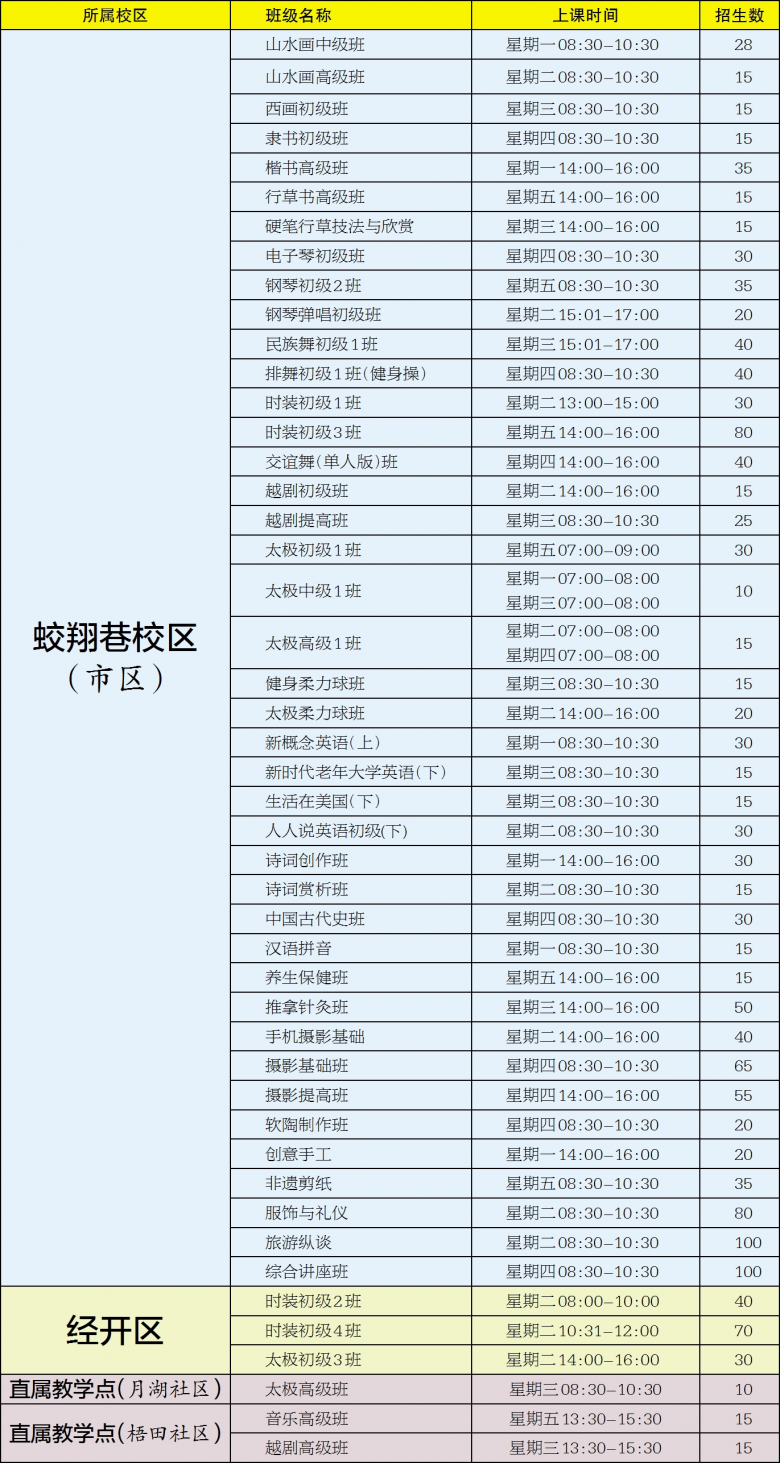 今年秋季招生,温州老年大学有17个专业157个班级可供选择,开学时间是9月5日。学习地点,包括蛟翔巷校区、松台校区、禅街校区、瑶溪校区、经开区校区等五个校区以及多 个社区直属教学点。学费按一学年(2022秋、2023春两个学期)收取,普通班120元/学期15次课,手机班170元/学期15次课等。本学期新增了短视频制作、服饰与礼仪、小提琴演奏班、电吹管(乐器)等班级。
