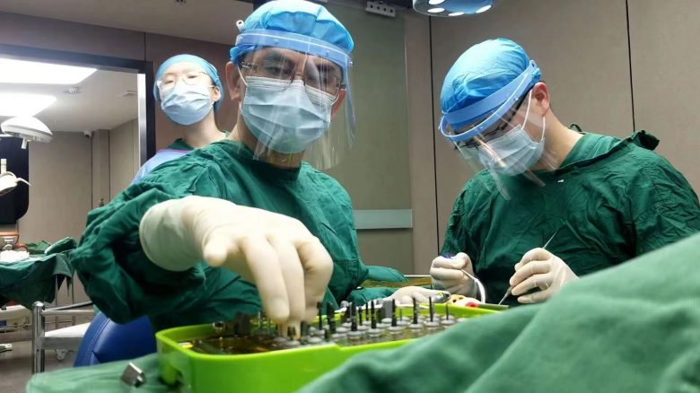 “对于上颌牙槽骨严重缺失的患者,如果全身健康状况良好,在具备条件的单位采用穿颧种植手术,则可以大大缩短患者的种牙时间,并且可减少术中大量植骨的风险,能较好地化解传统种植牙手术中难以解决的牙槽骨严重缺失问题。”黎强博士介绍。由于颧骨相对较硬,穿颧种植就是把种植体植入到颧骨上,其稳定性、受力性都较好。但这种手术所用的植体比普通的种植体长很多,医生如果技术不熟练很容易出现问题,术前还必须对患者头面部每一个细节了如指掌,要根据电脑三维图片及头颅模型,精准定位每颗种植体的“桩位”,手术“通道”避开面部神经、血管,还要提防伤及颧骨上方的眼睛,确保穿颧术在安全的情况下顺利完成。因此,对医院的软硬件和医生经验要求较为严苛,如须有专业口腔CT提供立体支持确保精确度,医生须具备丰富的口腔颌面外科、疑难种植、美学修复等临床经验。