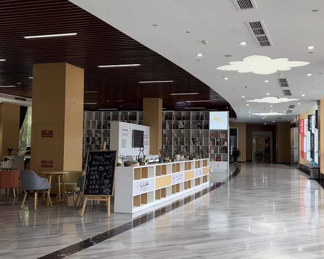 一楼走廊设有美食休闲吧(如下图),精致糕点、现榨果汁,还有咖啡飘香,大家忍不住点了一杯,还随手在旁边的开放式书吧取下一本书翻一翻。呃,差点又忘了我们身处医院……