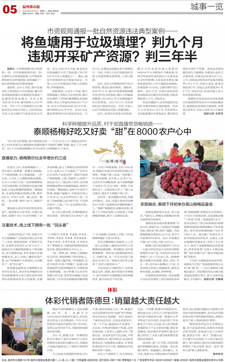 “好山好水好杨梅,原汁原味原生态……”6月25日上午,泰顺县包垟乡岩上村党支部书记龚海港在直播间推介当地的“湖畔”杨梅,吸引了不少网民。仅3个小时收到杨梅订单700多份,总销售额10万余元。