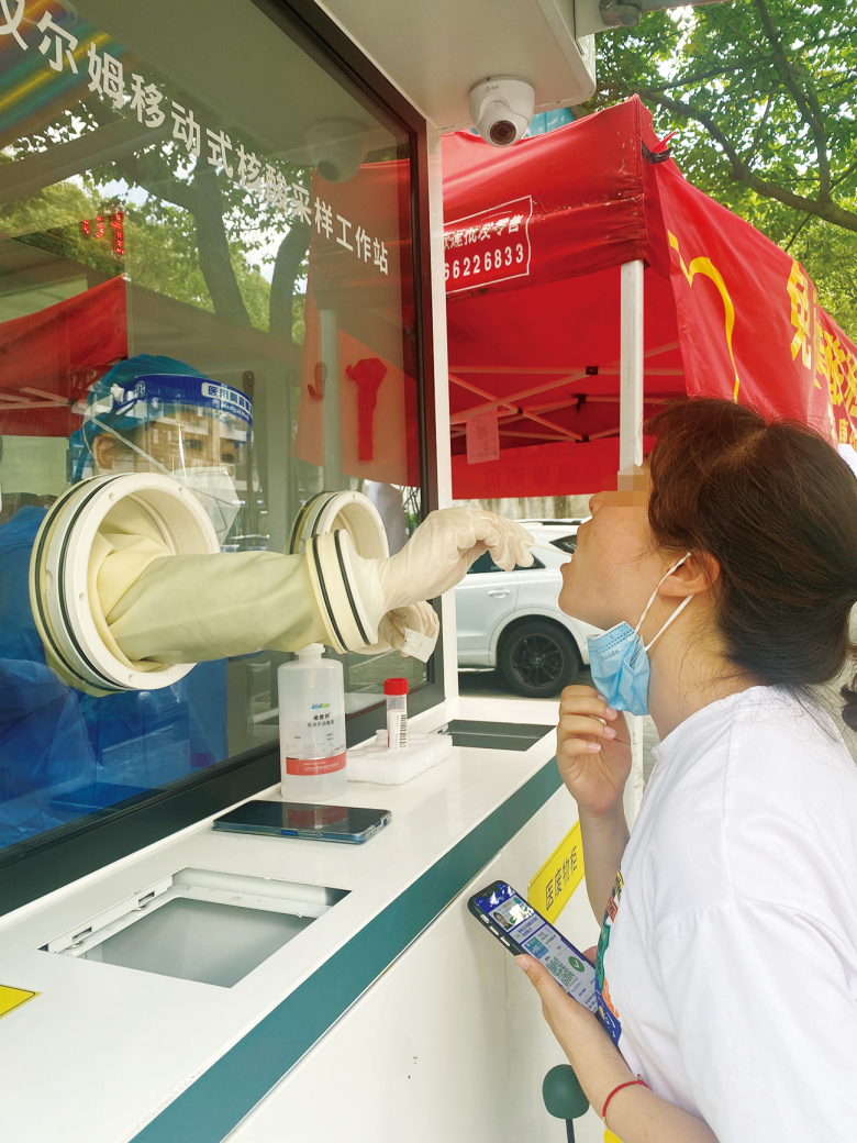 昨天,市区府前街张济堂药店门口的移动式核酸采样工作站完成调试,现场马上就有市民去体验(见下图)。